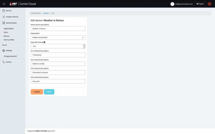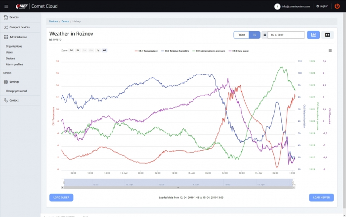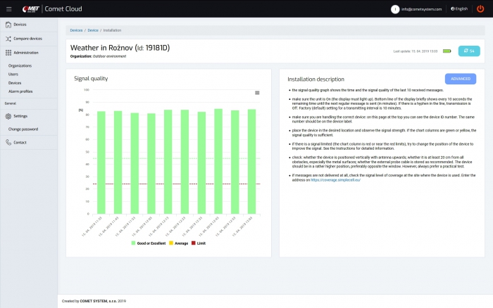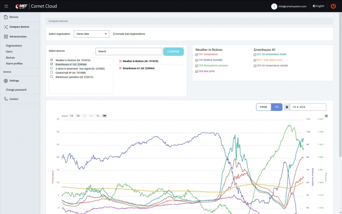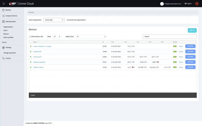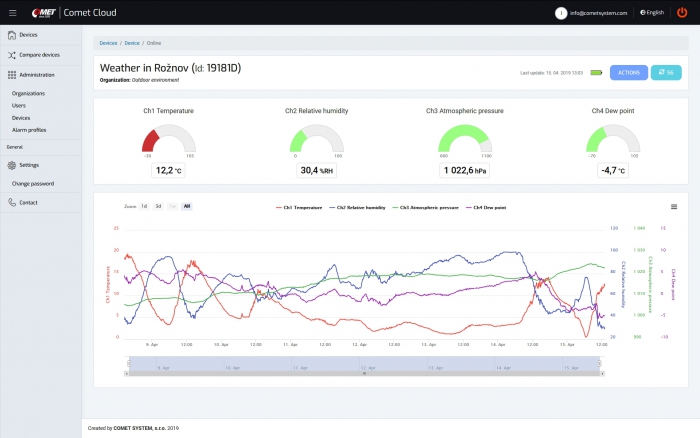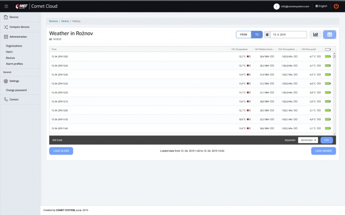 COMET Cloud is the internet storage of data measured by COMET wireless sensors at the Sigfox Internet of Things network. Data are accessible in the internet and displayed in an internet browser.